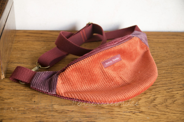 Tissu velours côtelé en trois couleurs orange, bordeaux et violet, fermeture et sangle bordeaux, doublure orange.